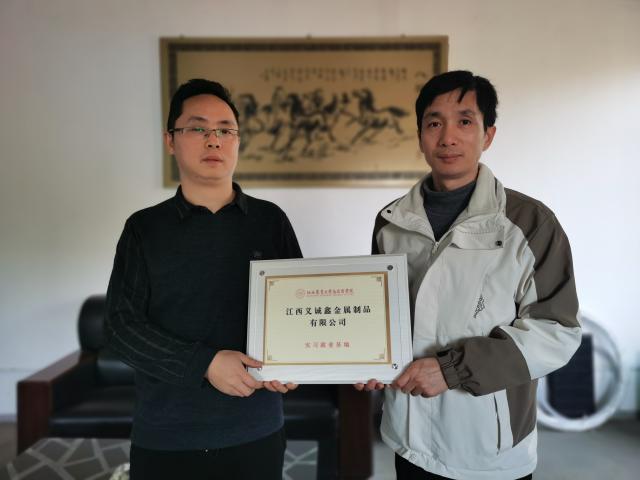 孙小飞一行深入工作车间感受企业氛围,并与负责人进行了座谈。孙小飞从学科建设、人才培养、学生就业、劳动教育等方面与江西义诚鑫金属制品有限公司负责人刘金洲、南昌优灿智能科技发展有限公司负责人邵徽波进行探讨交流,校企双方在推动科研平台共建、产学研合作、拓宽就业岗位等方面达成了共识。孙小飞向各企业负责人授牌。
